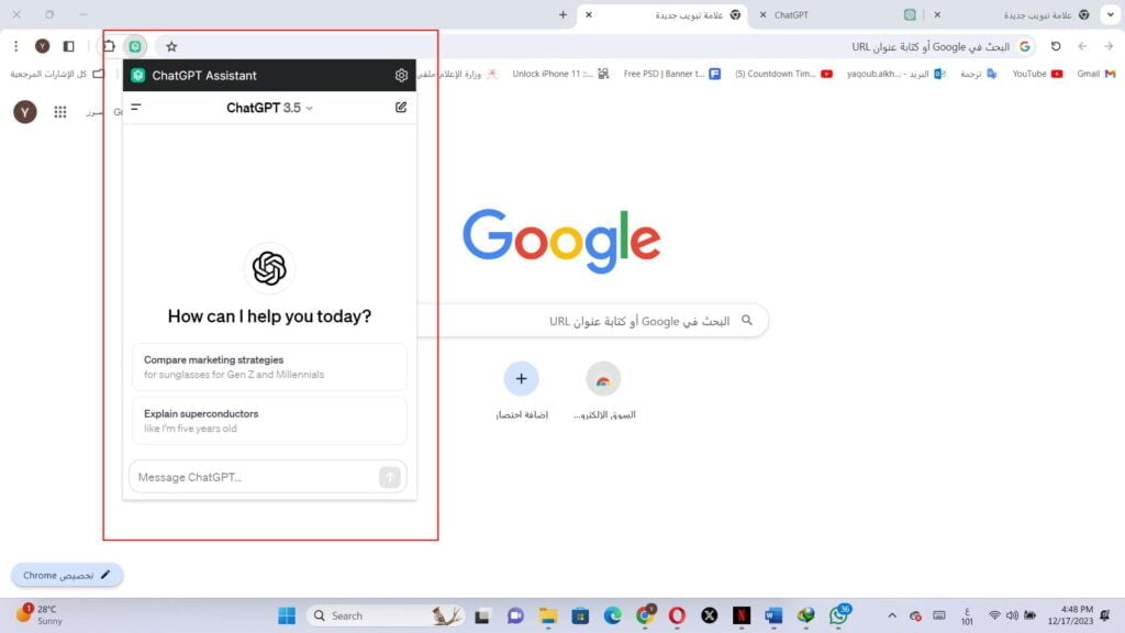 الخطوة الخامسة: وهكذا تم تثبيت أداة ChatGPT في المتصفح ولإظهاره أضغط على صورة البازل الظاهرة على يسار المتصفح في الأعلى.