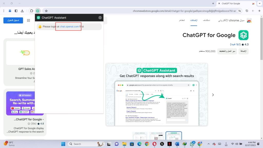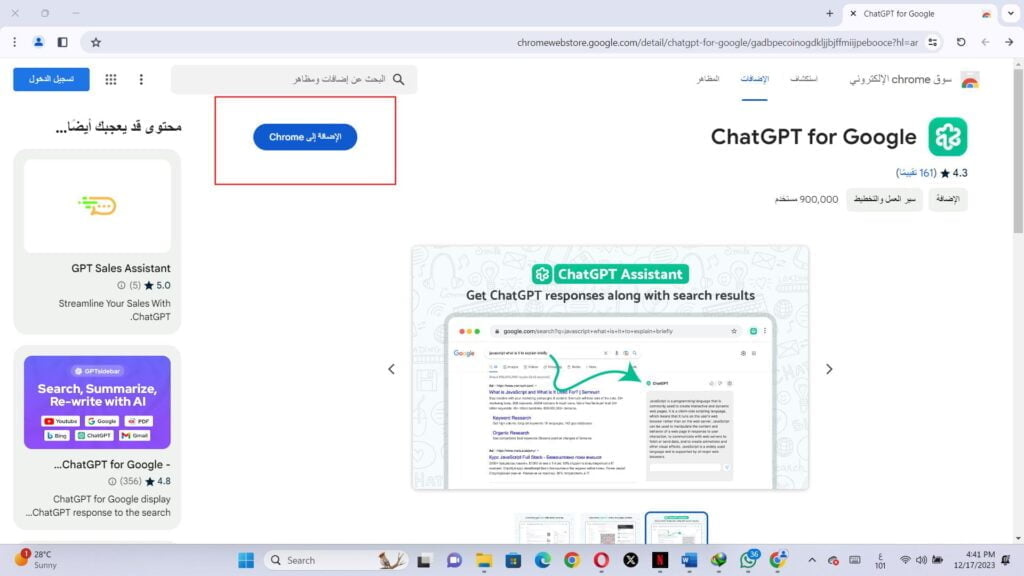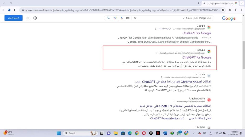 الخطوة الأولى: أفتح متصفح جوجل كروم (Google Chrome) وأكتب في محرك البحث (إضافة ChatGPT لمتصفح جوجل كروم).