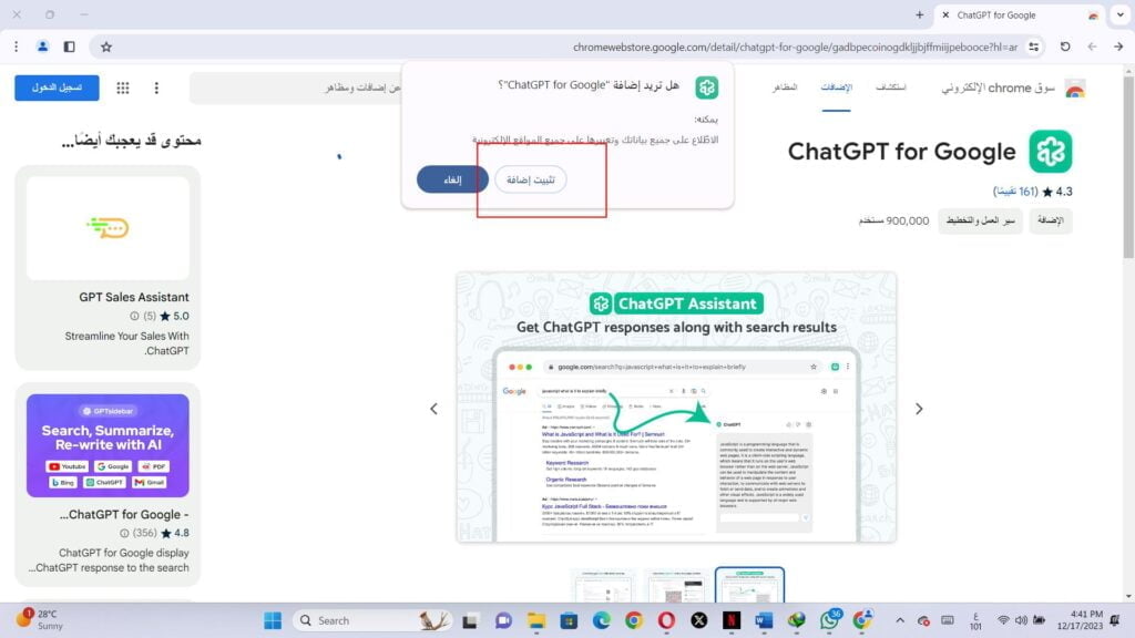 الخطوة الرابعة: ستظهر لك نافذة فيها سؤال هل تريد إضافة ” ChatGPT for Google” أضغط على تثبيت إضافة.