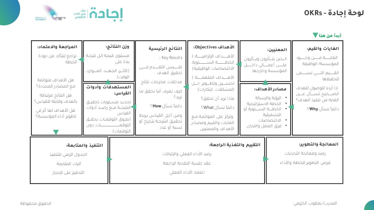 في هذه الرحلة اكتشفت الكثير من الفرص وتعرفت على بعض التحديات التي تواجه الموظفين في تطبيق الإجادة الفردية وعملية إعداد الخطط الفردية بمنهجية (OKRs) وتعلمت بأن كل تحدي يجب الوقوف له ومعالجته دون تجاهله للوصول إلى الإجادة التي نطمح لها.