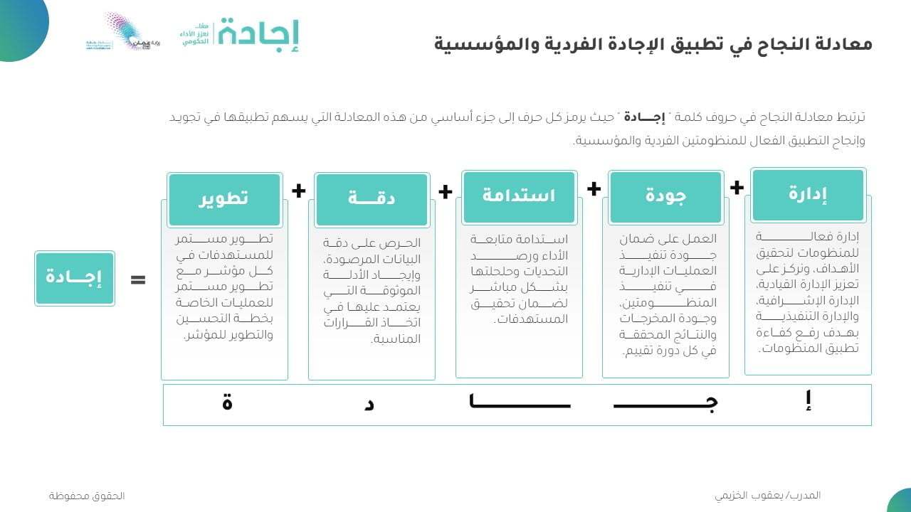 في رحلتي المميزة بين ولايات محافظة ظفار الجميلة بأجواء شتوية رائعة، استطعت صياغة معادلة تساهم بشكل كبير في إنجاح تطبيق المنظومتين الفردية والمؤسسية حيث تتكون هذه المعادلة من (5) مكونات أساسية وهي عبارة عن أحرف كلمة ” إجادة ” (إدارة، جودة، استدامة، دقة، تطوير) :
